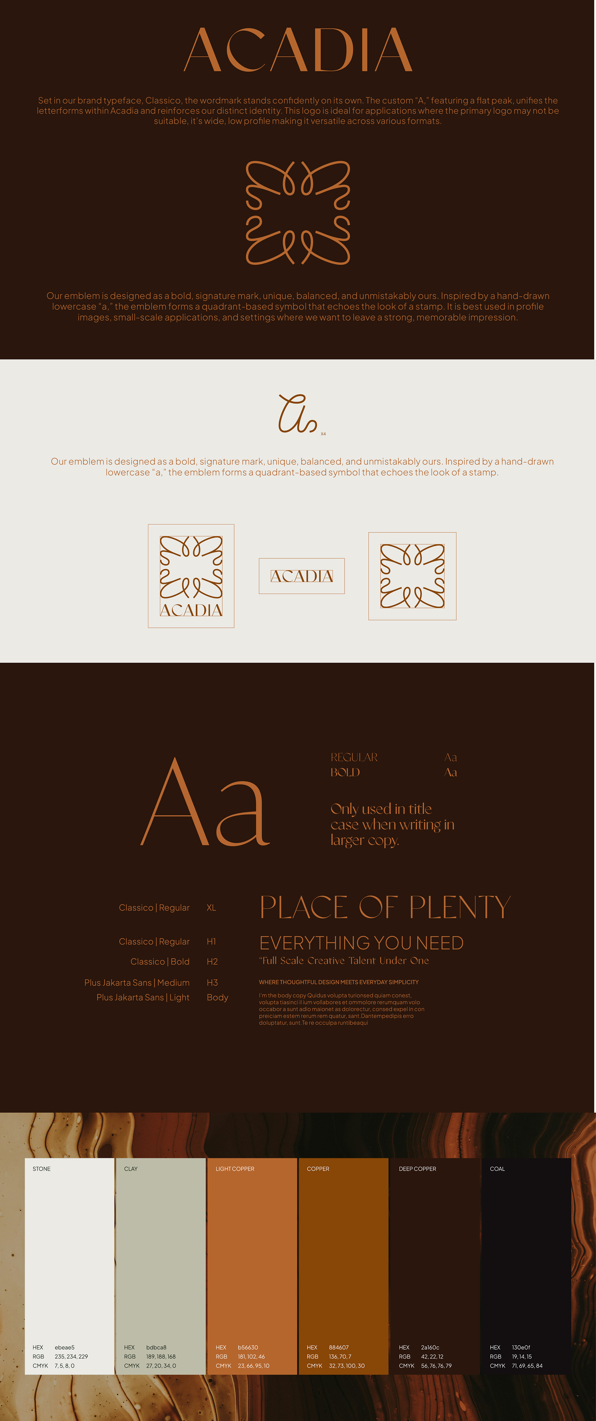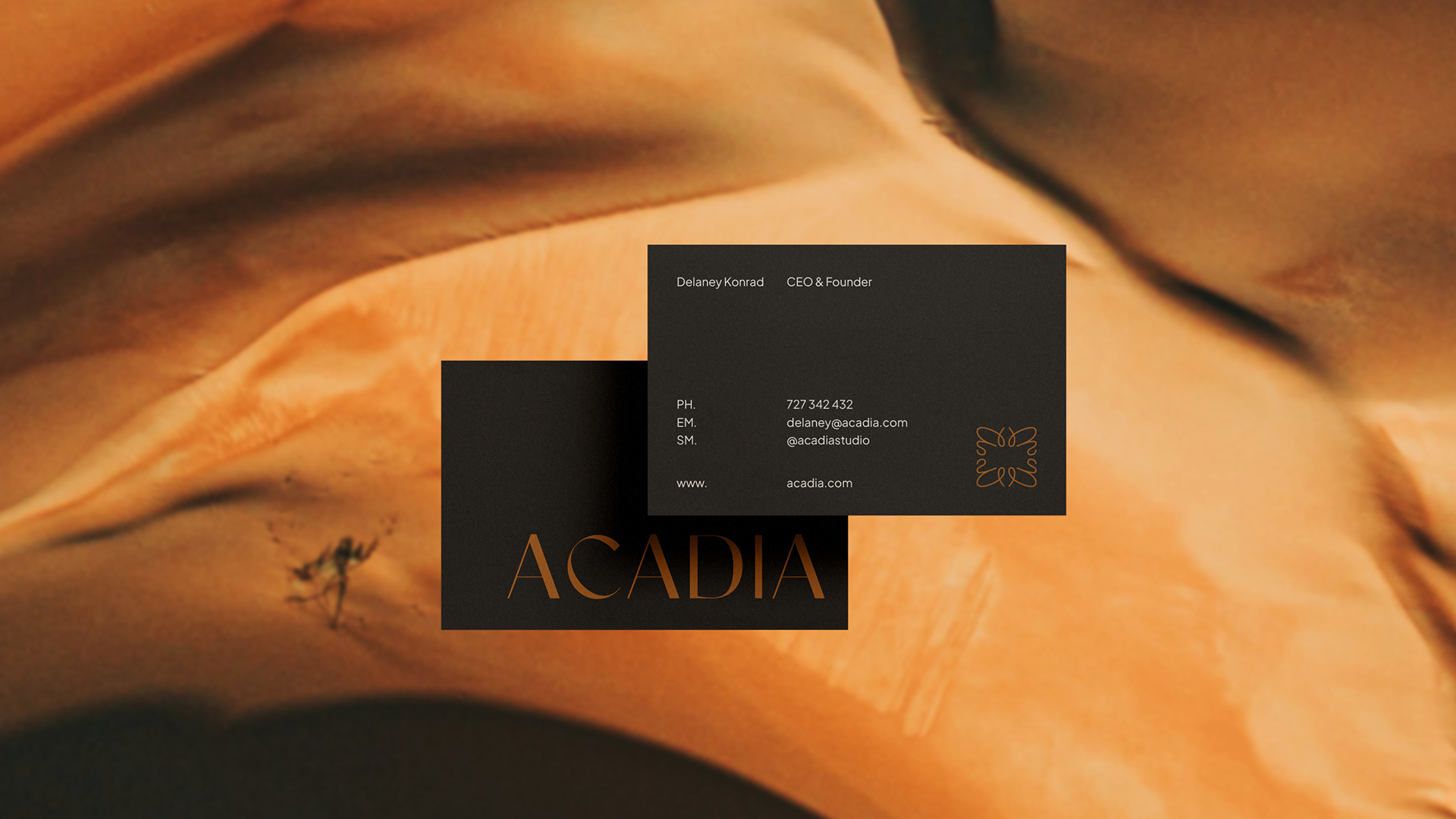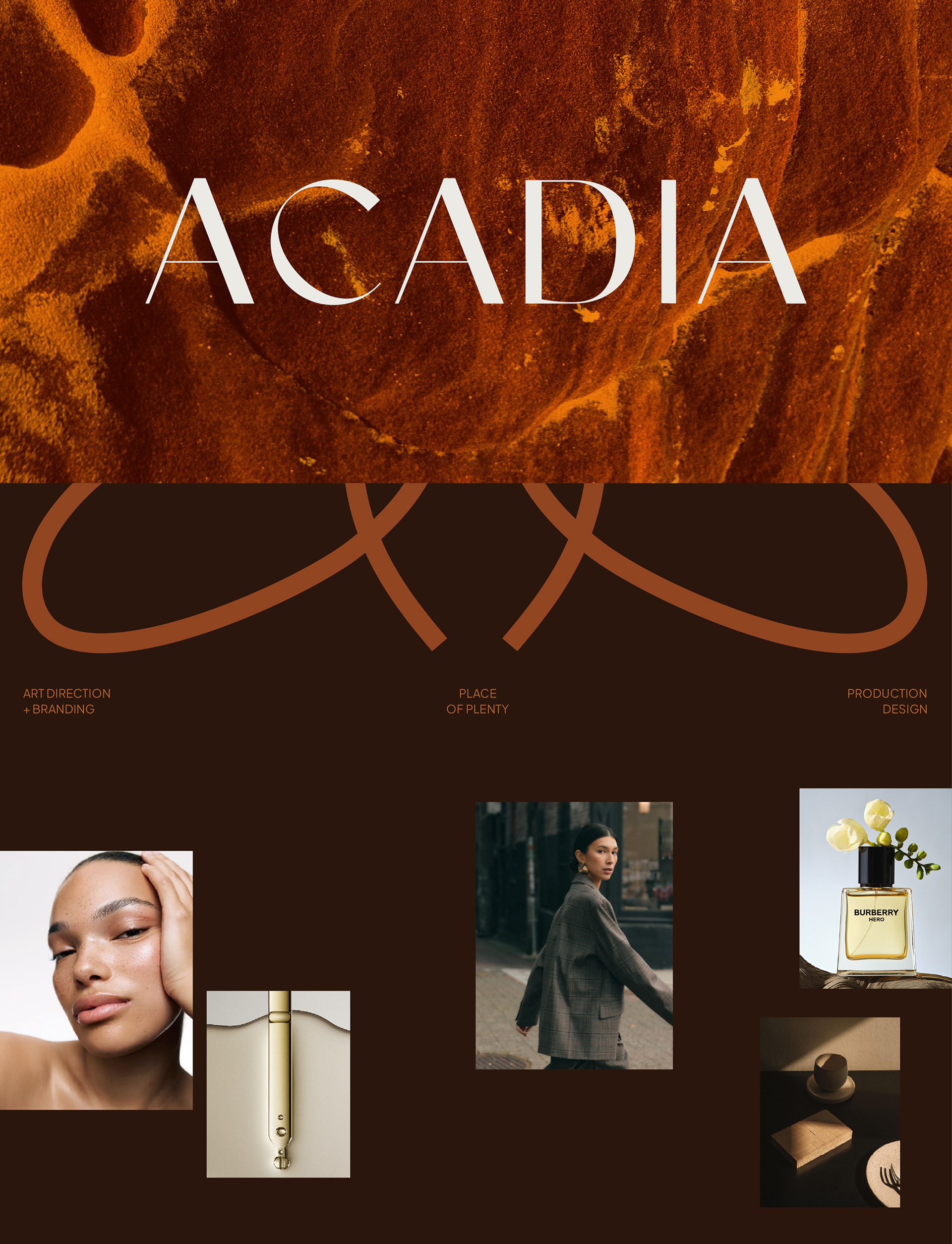 ACADIA is a creative agency to allow clients to access all their needs in one place, a place of plenty. I created their full guidelines including logo suite, colour palette, photography style, and business cards.
