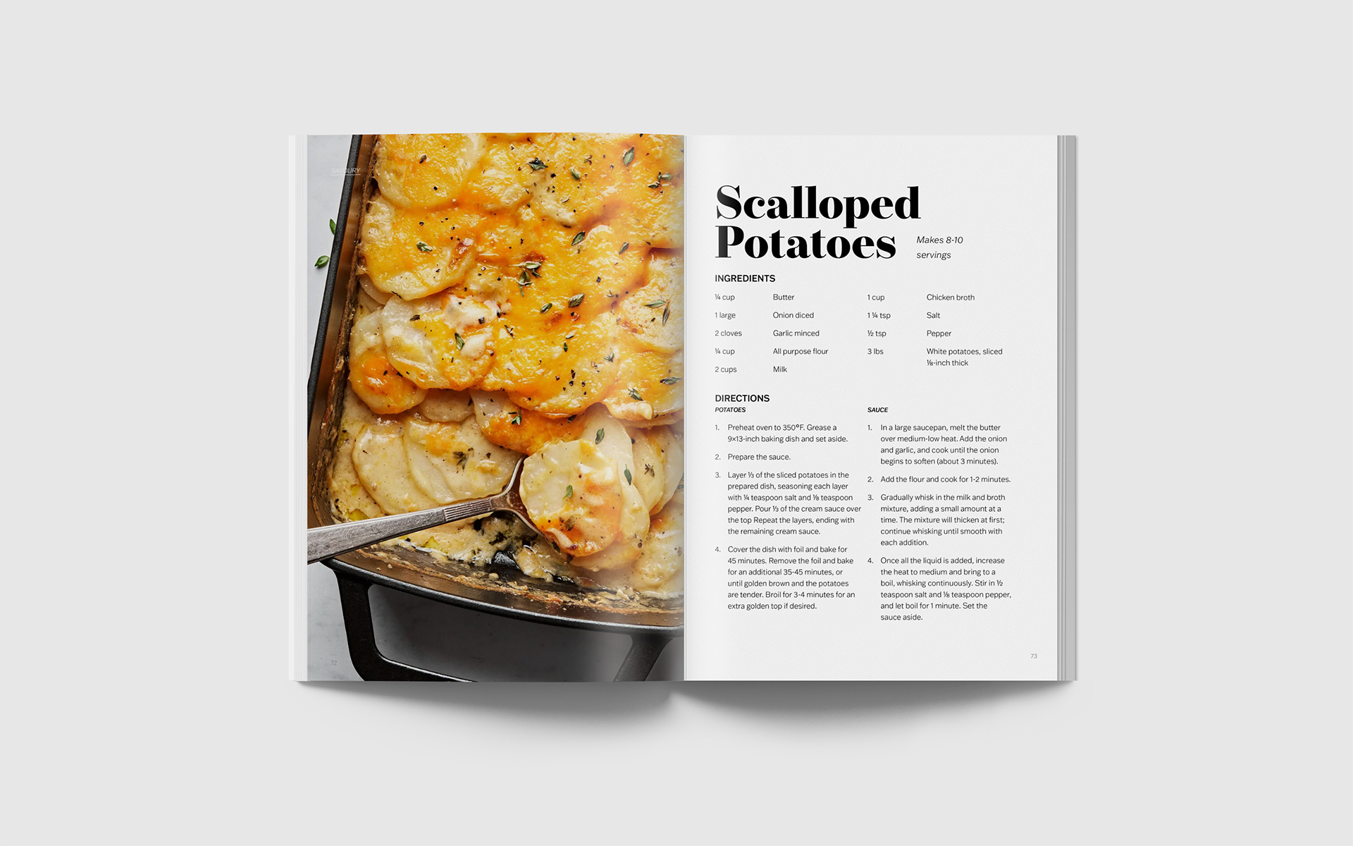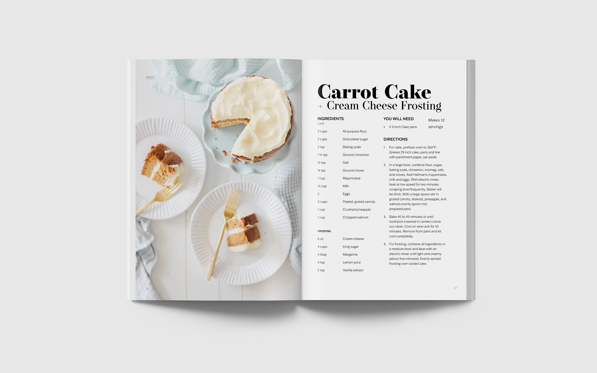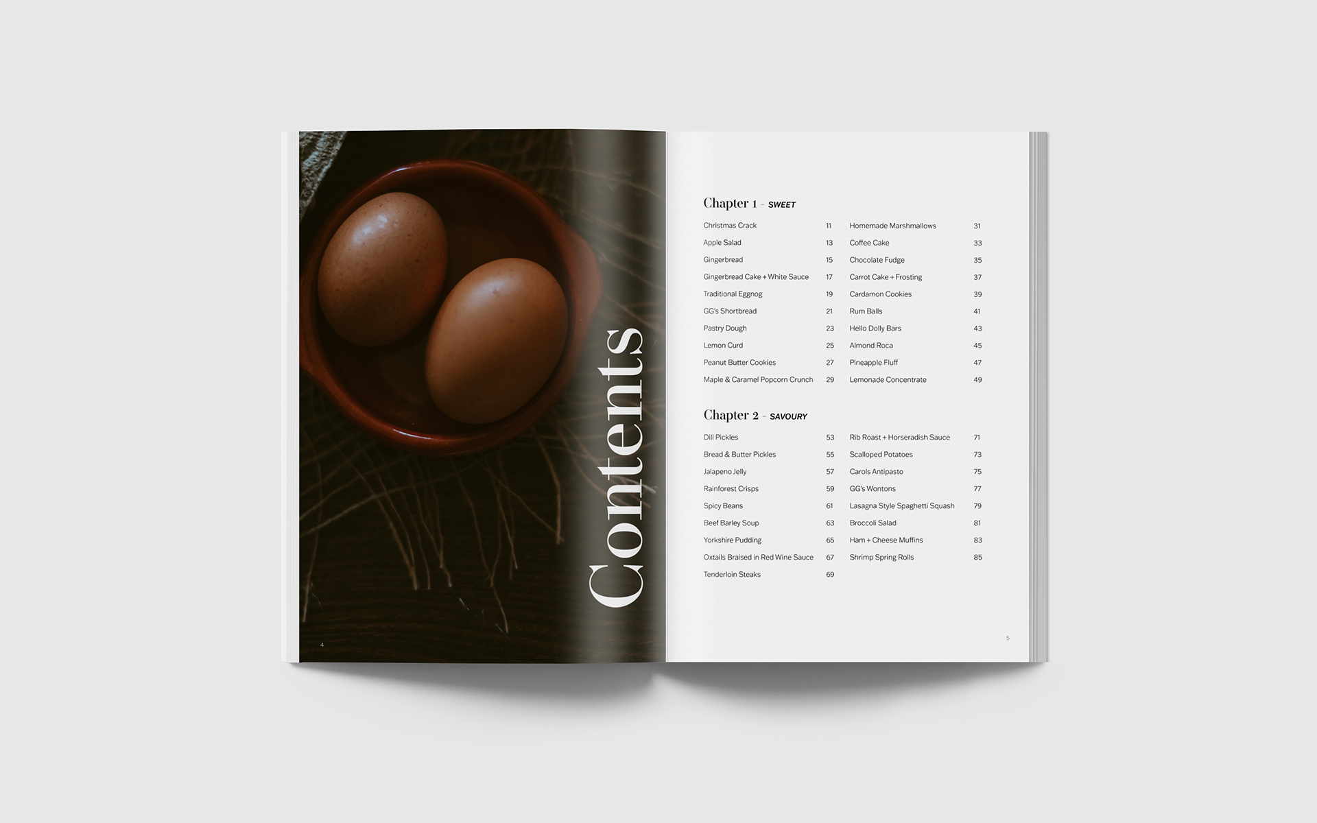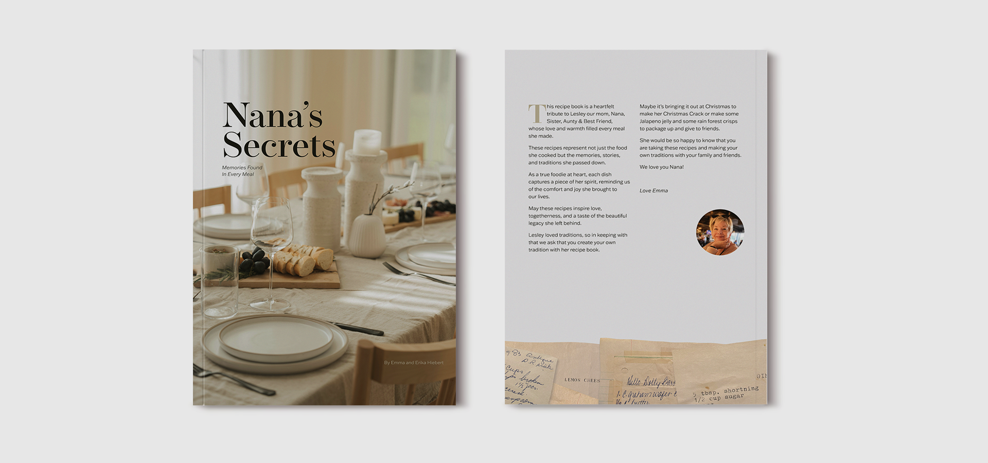I designed a heartfelt family cookbook in memory of my nana, featuring transcribed recipes from her large collection of handwritten recipes. This was a personal project, and all imagery was personally produced or royalty-free.